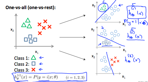 - Train a logistic regression classifier $h_\theta(x)$ for each class to predict the probability that  y = i .