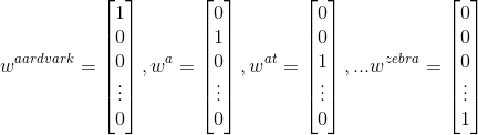 我们从最简单的 $one\text{-}hot$ 向量的词向量方法开始:代表每个词都是一个 $\mathbb{R}^{|V|\times 1}$ 向量,其中除了该单词所在的索引为 $1$ 外其他索引都是 $0$。在这个定义下,$|V|$ 是词汇表的大小。这种词向量的可以如下表示