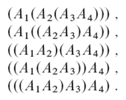 给定n 个矩阵的序列,希望求它们的乘积:$A_1A_2A_3…A_n$ 。因为矩阵的乘法满足结合律,所以可以对n个矩阵序列加括号,来改变乘积顺序。比如对于矩阵链< $A_1$, $A_2$,$A_3$,$A_4$>可以有下面的加括号方案: