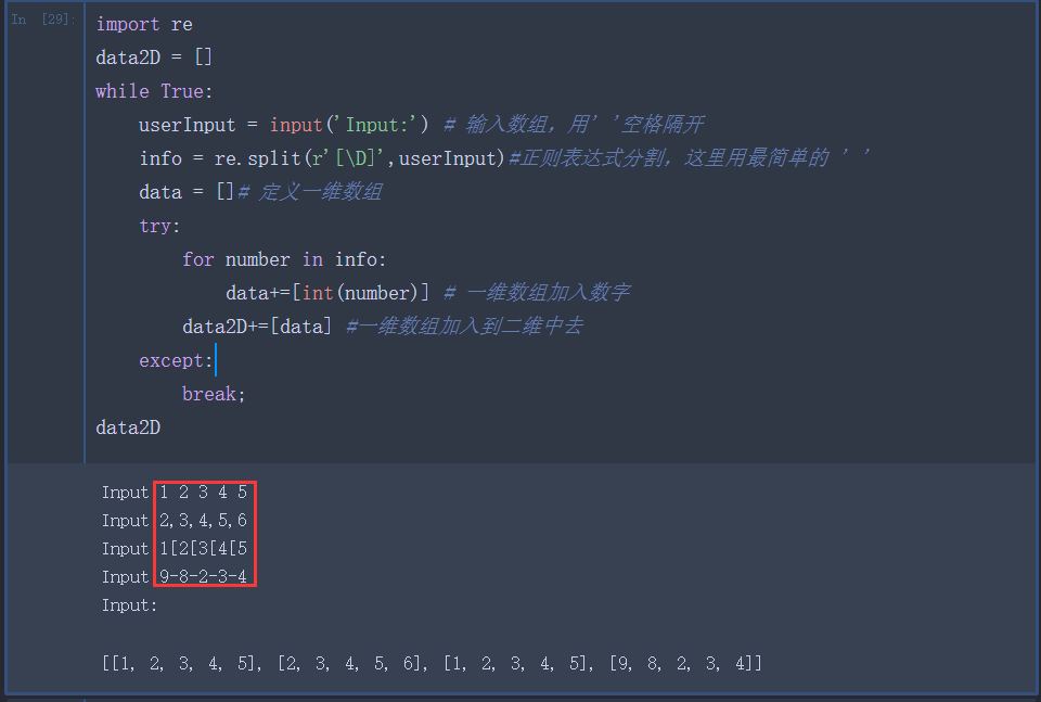 在以上的基础上,我们可以用python输入二维数组