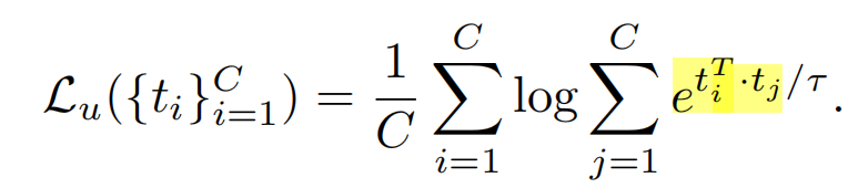 $\sum\limits^C_{j=1}e^{t_j^T·t_j}$ 的结果必然是 $>e^C$ 的,因为 $t_j$ (j 取了所有的 class) 是包含 $t_i$ 的,所以 $\exists t_i^T·t_j >= 1$ ,最后整个 loss 也是总大于 1 的。 $t_i$ 和 $t_j$ 距离越远,那么乘积就越小,最后相加的结果就越小,即可以推导出 loss 越小。实现了所有 class 间距最大的目标。