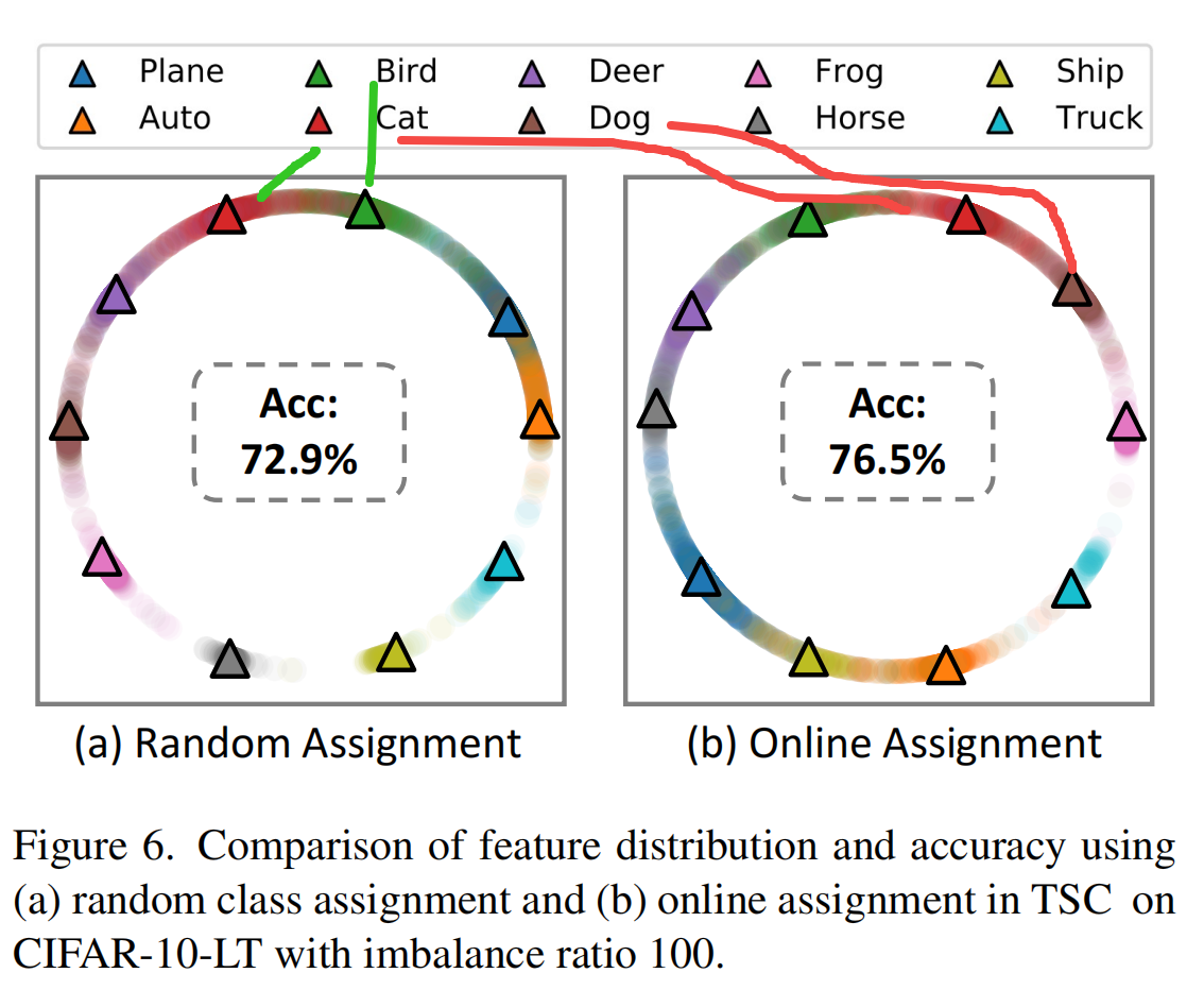 本文提出了一种更平衡的表征方法,同时能够学习到统一的特征空间,使长尾分布的数据在特征空间能够更加均匀的分布。实现方式是通过预先指定的 target position, 让 embedding 向着对应 target 方向移动,从而确保分布永远是均匀的(因为位置已经被提前设计好了,不管数据分布怎么变,target是不变了)。