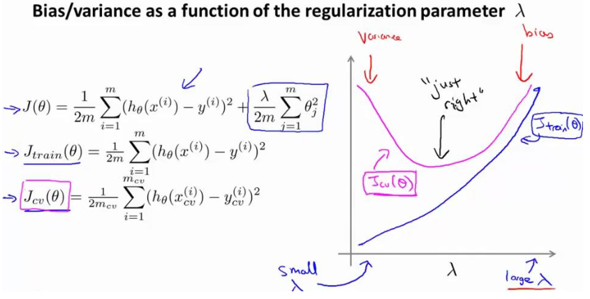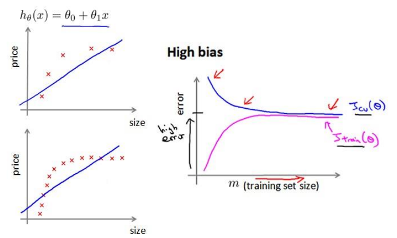 - High bias (underfitting): both $J{train}(\Theta)$ and $J{CV}(\Theta)$ will be high. Also, $J{CV}(\Theta) \approx J{train}(\Theta)$.