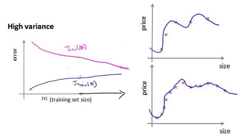 - High variance (overfitting): $J{train}(\Theta)$ will be low and $J{CV}(\Theta)$ will be much greater than $J_{train}(\Theta)$.