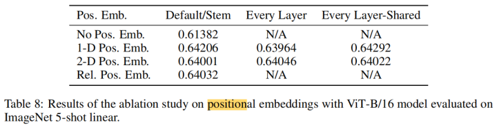 - 1-D positional embedding:把2-D的patchs看成1-D序列